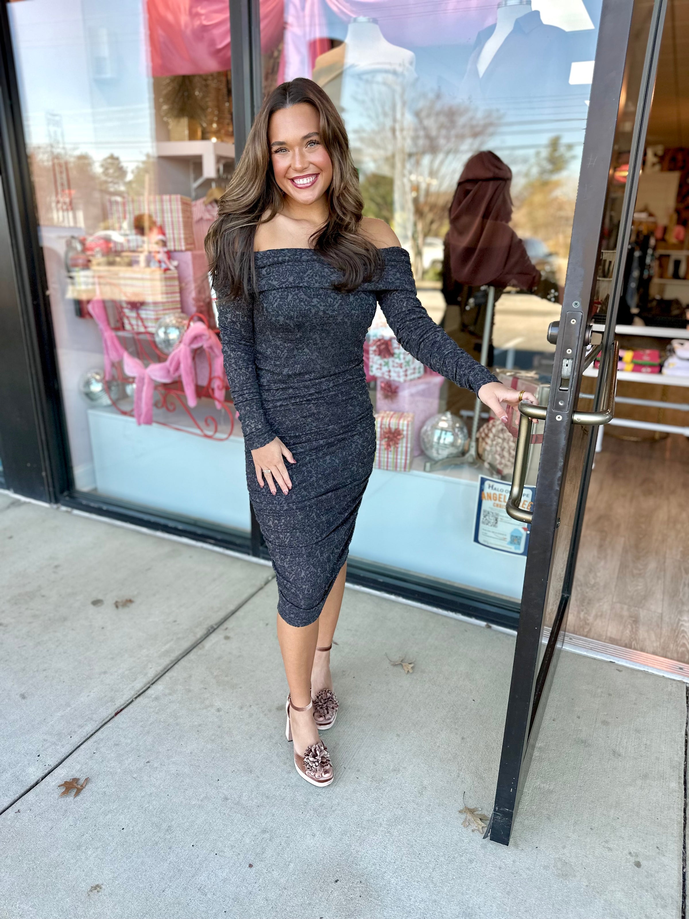 FRNCH Amii Grey Lace Off-Shoulder BodyCon Dress
