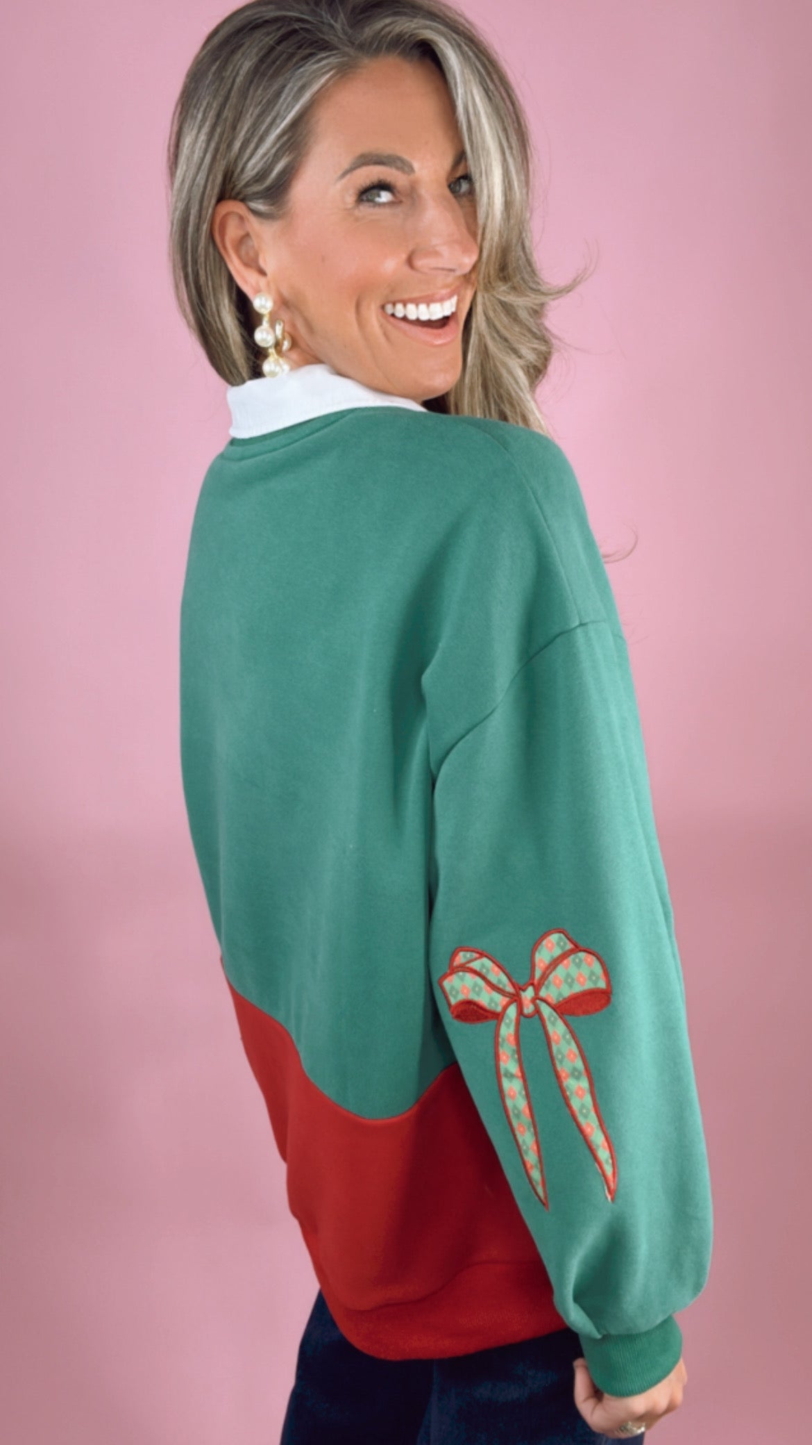 Queen of Sparkles Green Christmas Living Room Sweatshirt w/ Bow Sleeves