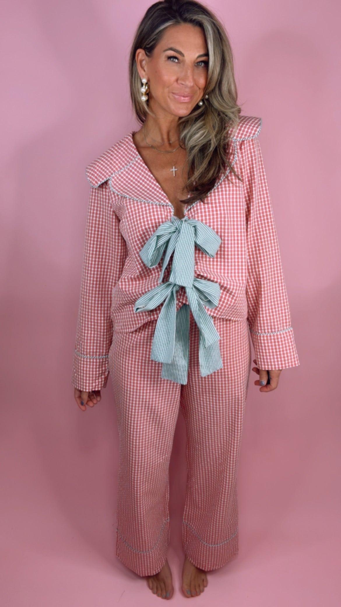Red Gingham Sailor Collar Tie Front Pajamas