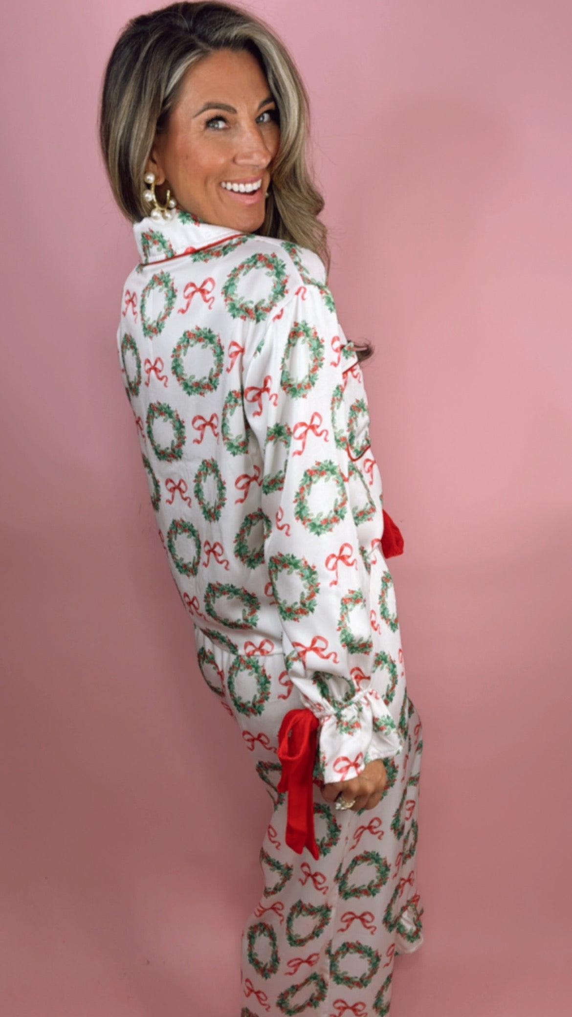 Satin Wreaths w/ Bows Red Velvet Trim Pajama Set