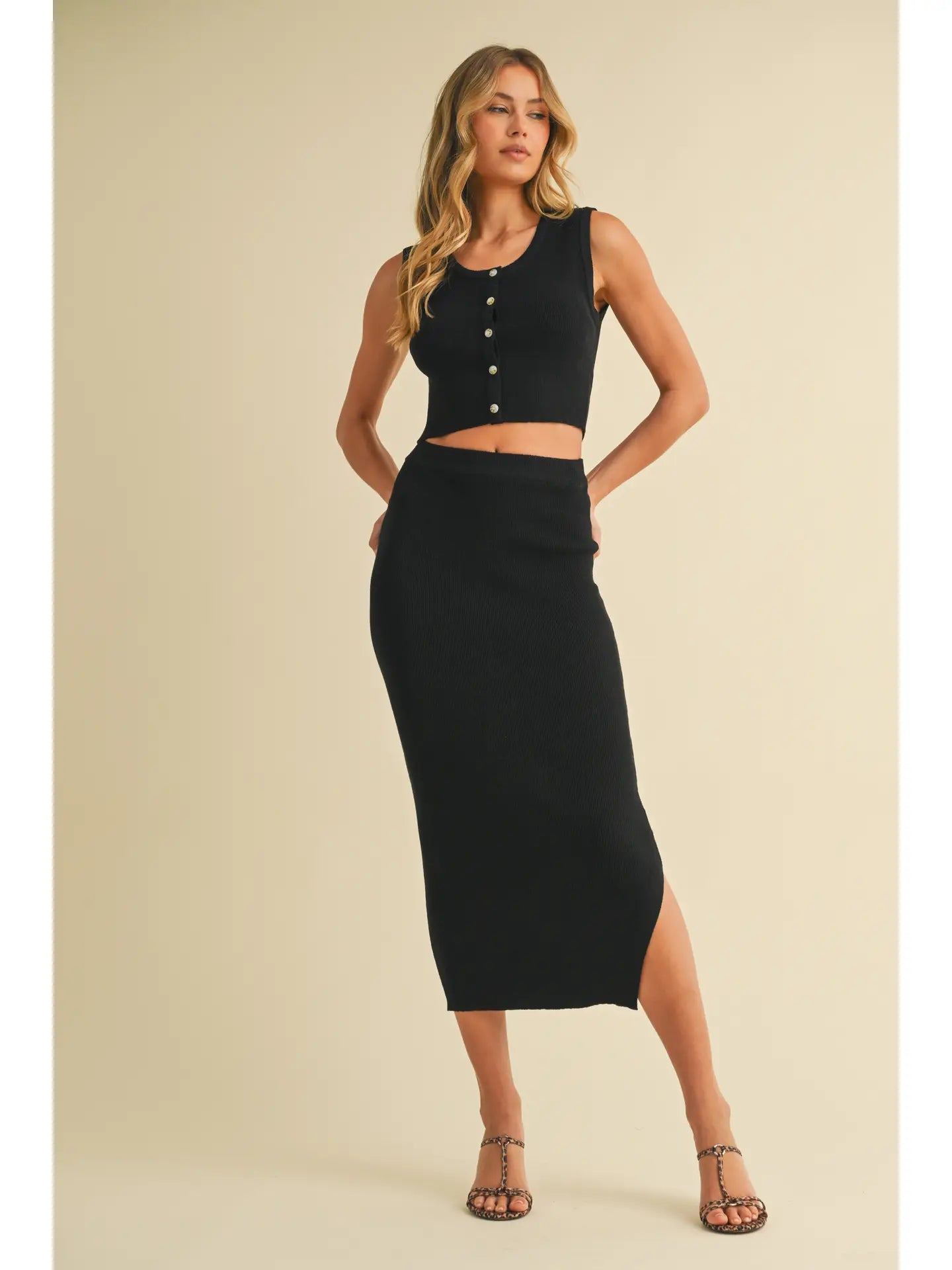 Black Button Down Sleeveless Cropped Top Midi Skirt Set