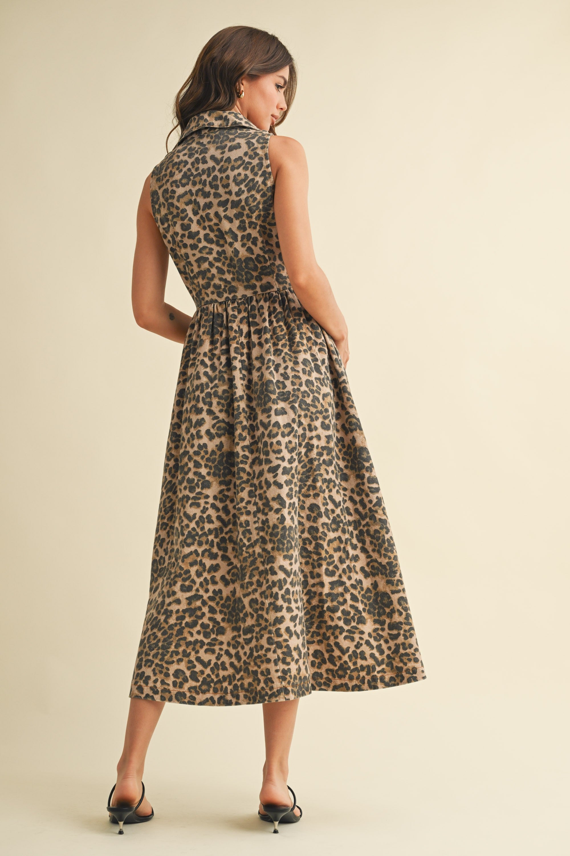 Leopard Denim Notched Collar Midi Dress
