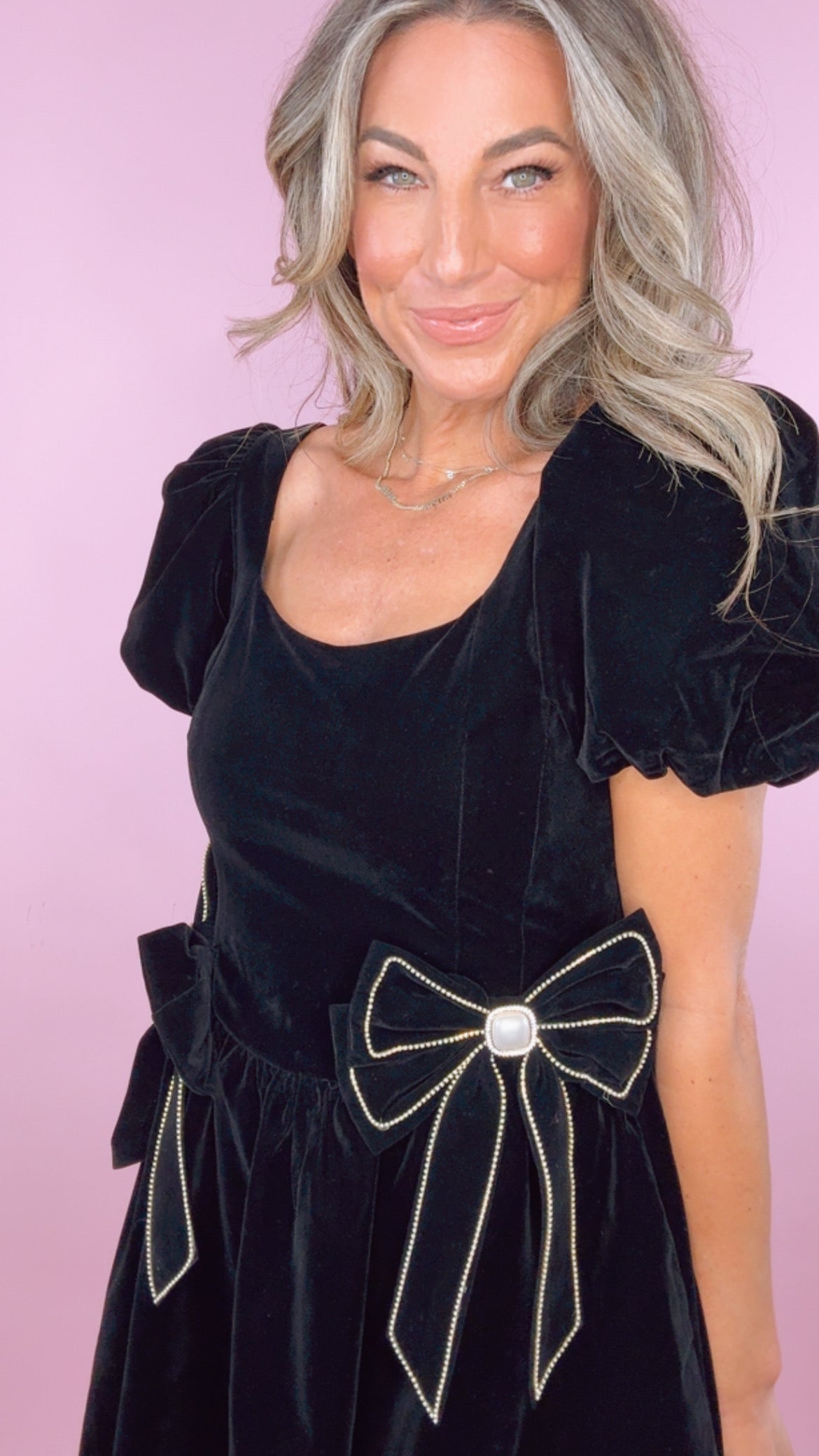 Moon River Black Velvet Rhinestone Bows Bubble Mini Dress