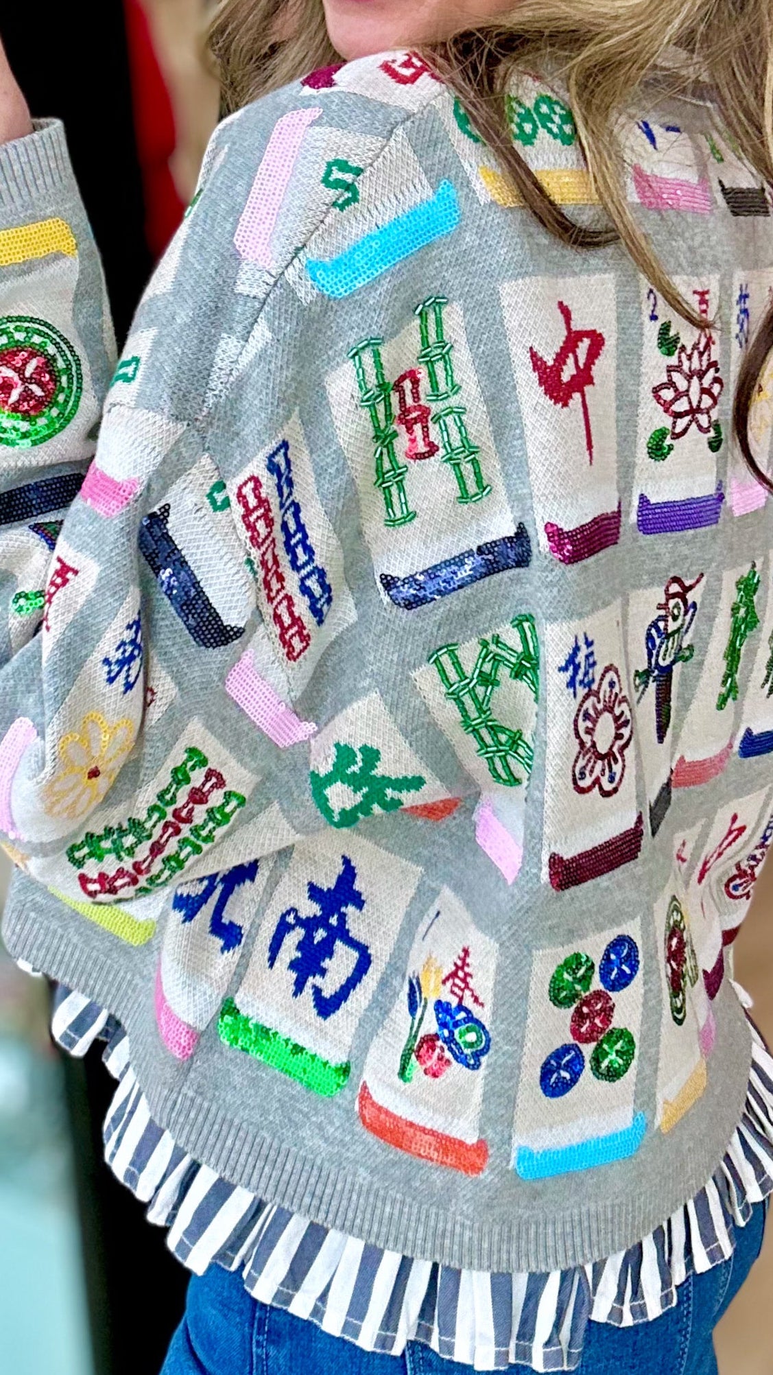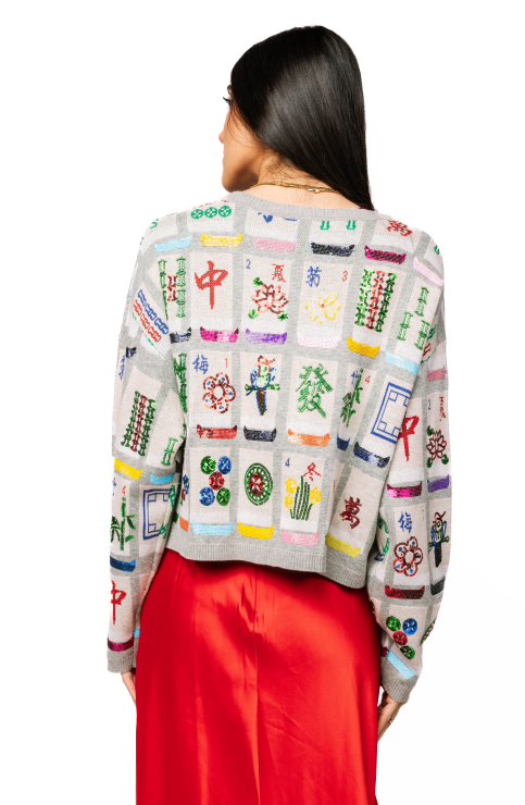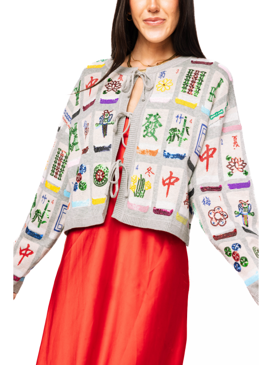 Queen of Sparkles Grey Mahjong Tile Tie-Up Knit Sweater