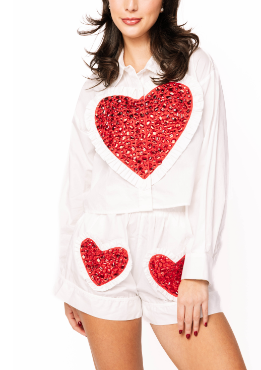 Queen of Sparkles White Jeweled Ruffle Heart Cotton Buttondown